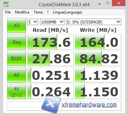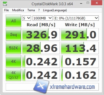 CrystalDiskMark è un utilissimo software per misurare le performance in lettura e in scrittura in modo sequenziale (sequential) e casuale (random), grazie al pieno supporto del NCQ (Native Command Queuing) l'ordine degli IOPS viene ottimizzato in modo da migliorare le prestazioni di input/output con una Queue Depth (file in coda) di 32, tale test consente di osservare il comportamento del drive durante il trasferimento di numerosi file con dimensioni ridotte.