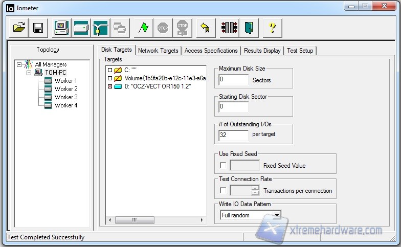 IOmeter è un pratico strumento e benchmark che ci permette di misurare i valori ottenuti da operazione di Input/Output caratteristiche di SSD o Hard Disk. Tramite IOmeter possiamo mettere in evidenza eventuali problemi o ancora testare in modo continuativo e dettagliato le prestazioni di un unita`. In questo caso abbiamo precaricato un file da quattro gruppi di lavoro che hanno messo sotto torchio il Vector 150. IOmeter dunque ci da una stima delle prestazioni di un’unità messa in condizioni di carichi di lavoro diversi.